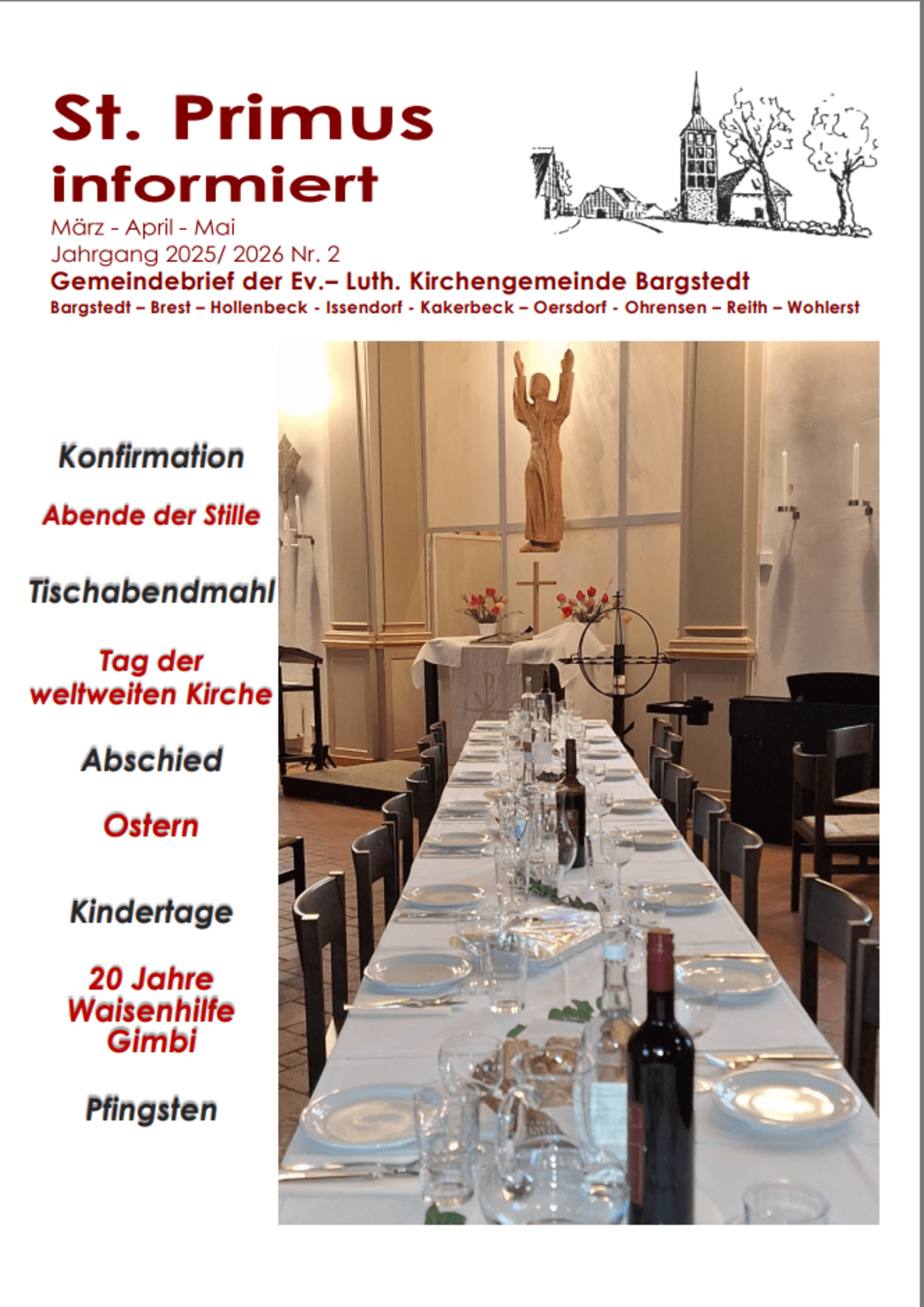 Termine Fr, 27. Februar 2026 18:00 Uhr Taizé Andacht Sa, 28. Februar 2026 10:00 Uhr Krabbelgottesdienst So, 1. März 2026 10:00 Uhr Gottesdienst mit Abendmahl (Saft) Fr, 6. März 2026 18:00 Uhr Kommt! Bringt eure Last. So, 8. März 2026 10:00 Uhr Gottesdienst Mi, 11. März 2026 20:00 Uhr Mitgliederversammlung Terminübersichtsseite