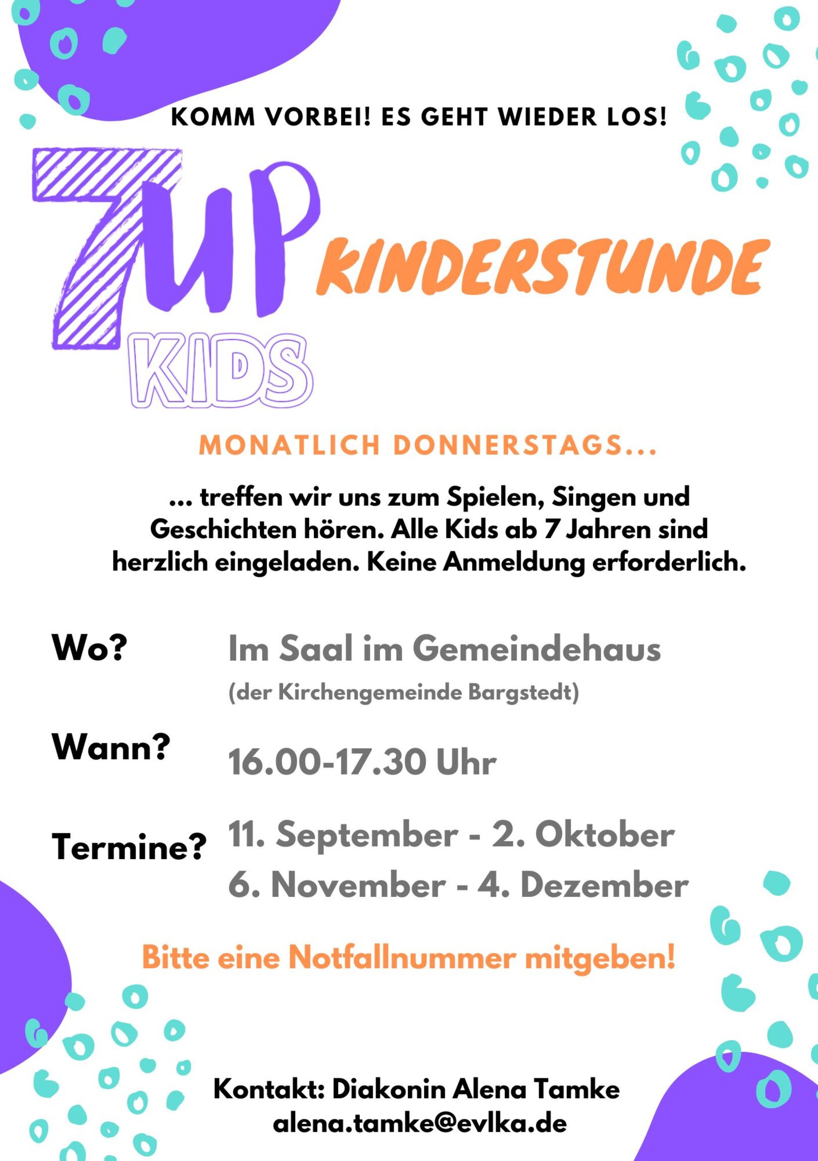 Einmal im Monat donnerstags (in der Schulzeit!) wollen wir mit euch gemeinsam Spielen, Spaß haben und auf Entdeckungsreise durch die Bibel gehen. Unser 7up startet jeweils um 16.00 Uhr im Gemeindehaus und endet um 17.30 Uhr für alle Kinder ab 7 Jahren.
